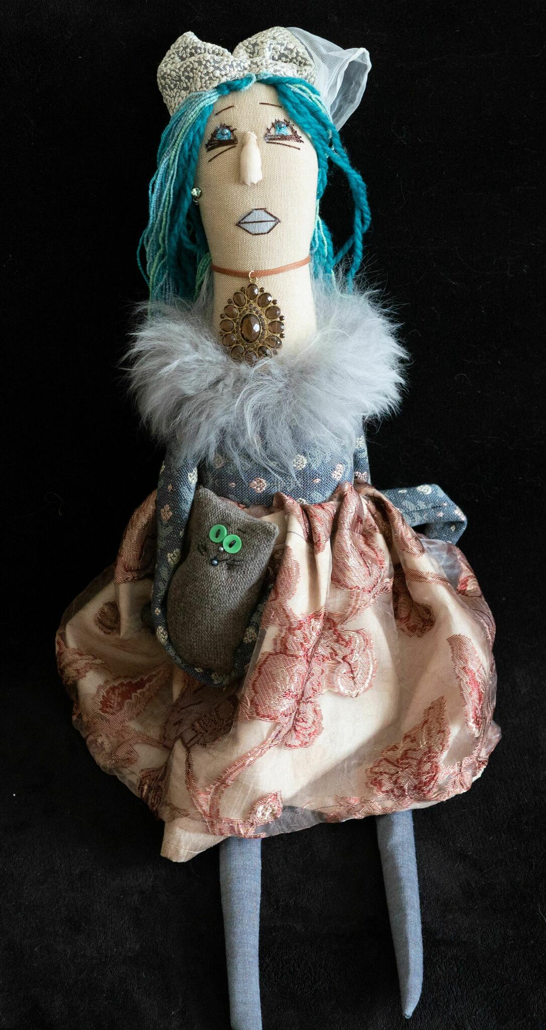 Käsitööna loodud, eriilmeline suur nukk kassiga