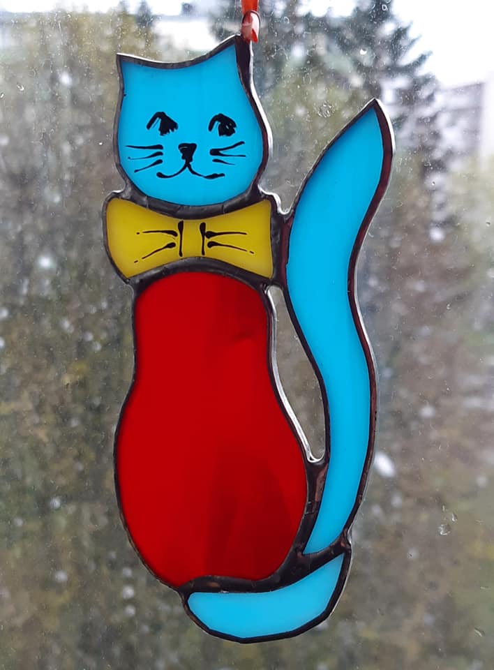 Erksavärviline (kollane, punane, helesinine) erineva tekstuuriga klaasist vitraaž
