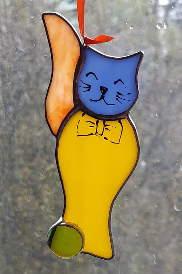 Erksavärviline (kollane, oranž, helesinine) erineva tekstuuriga klaasist vitraaž