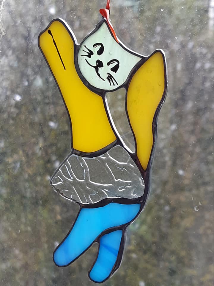 Erksavärviline (valge, kollane, helesinine) erineva tekstuuriga klaasist vitraaž