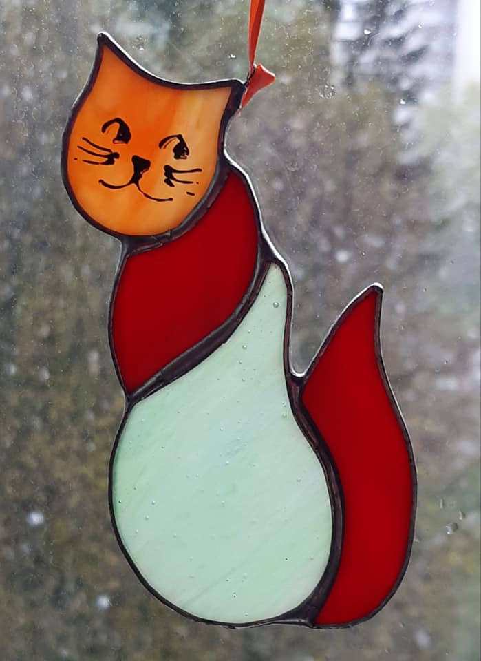 Erksavärviline (oranž, punane, heleroheline) erineva tekstuuriga klaasist vitraaž