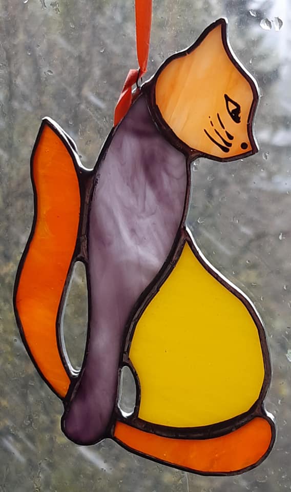 Erksavärviline (kollane, oranž, helelilla) erineva tekstuuriga klaasist vitraaž